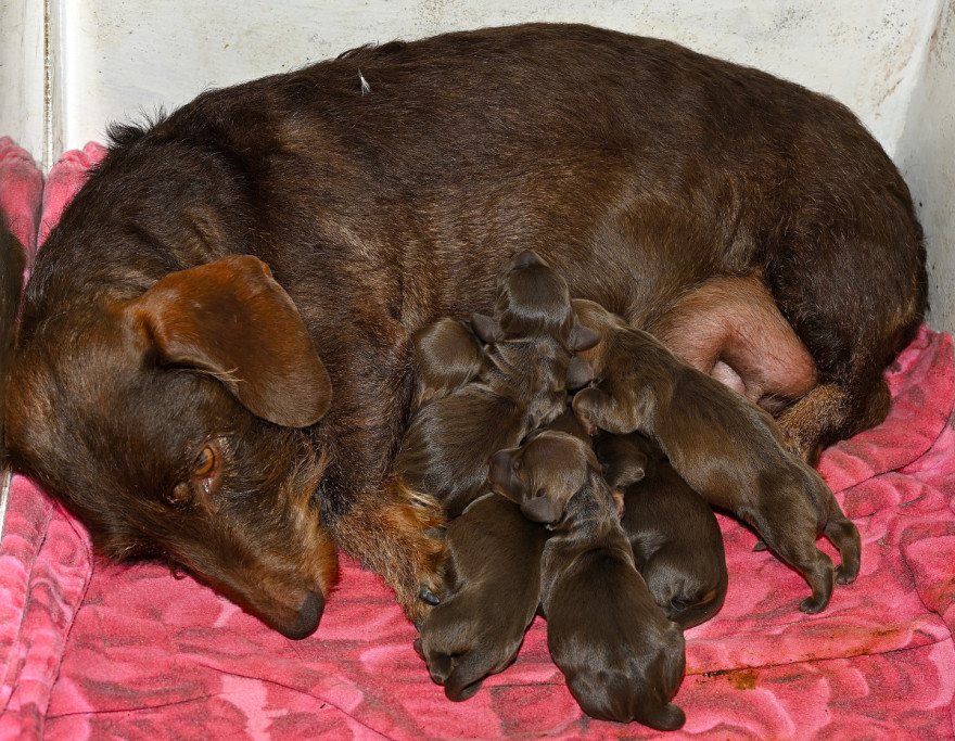 Vor dem verdienten Ruhestand hatte ich für unsere hübsche Hasel noch einmal einen außergewöhnlichen Rüden ausgesucht, CH-Ch SKG 2014 CH-VGH SDC 2015 GS 2015 WUT-WorkCh 2017 AVetTW VDH 2019 D-VetCh 2019 LS-Vet 2019 Giotto vom Eisenstein 11T0667R SHSB/LOS 706351, br. m. Abz., WT 14.01.2011, BhFK/95 BhN(F) CH-Wa.T. ESw H-BhFK H-Wa.T. PL-Int.BhFK SK-BhFK SchwhK Sfk Sp VpoSp, GTB.86/2015, V. Das Ergebnis sind 2,1 braunrote und 1,2 braunsaufarbene Welpen, es ist spannend, was aus ihnen werden wird.