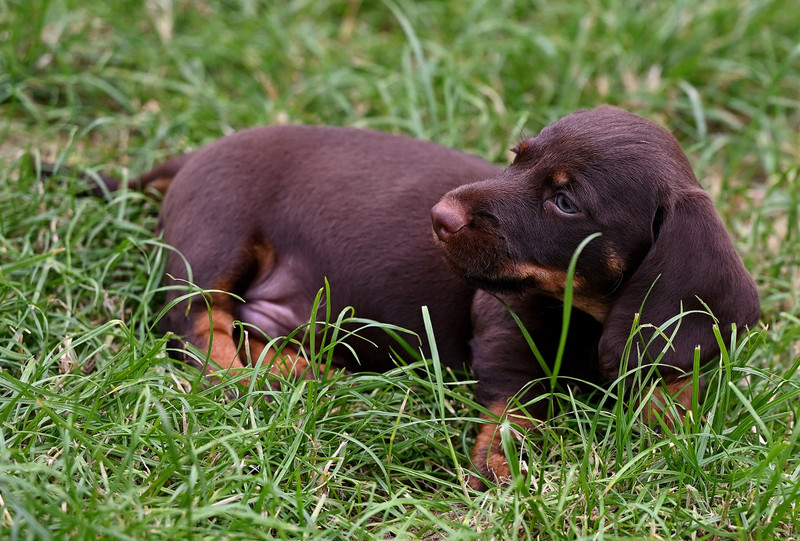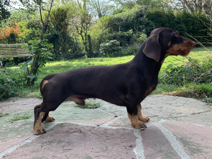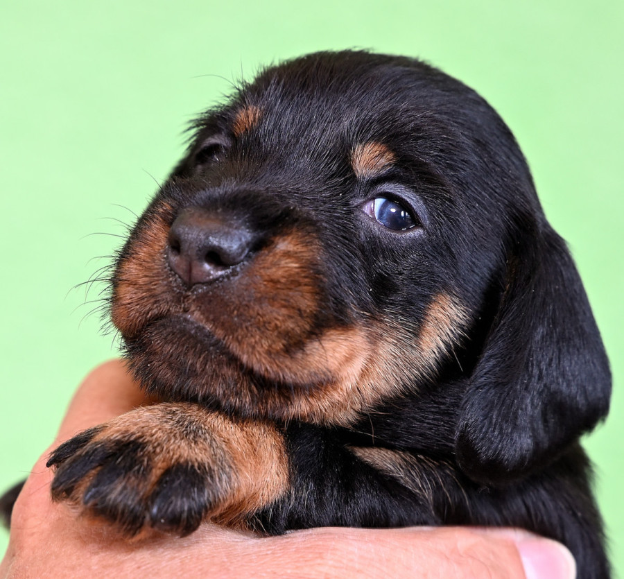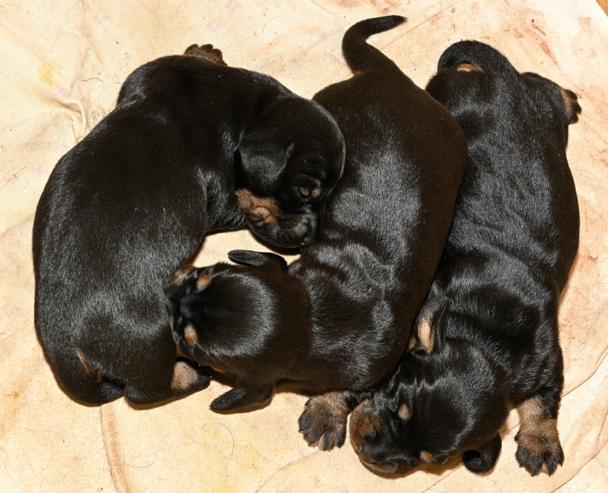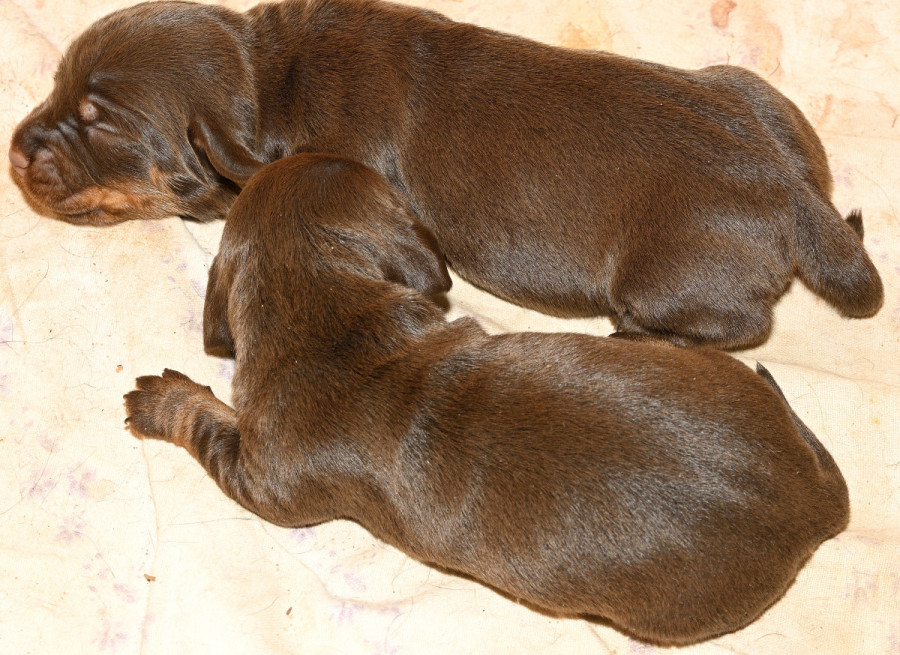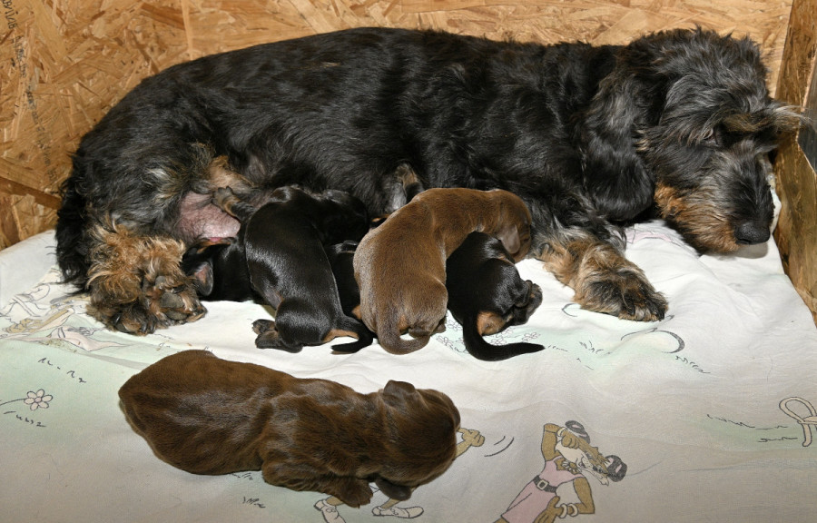 Am 6. Mai warf Molly aus dieser Paarung fünf starke Welpen, zwei Rüden in Braunrot und drei Hündinnen in Schwarzrot.