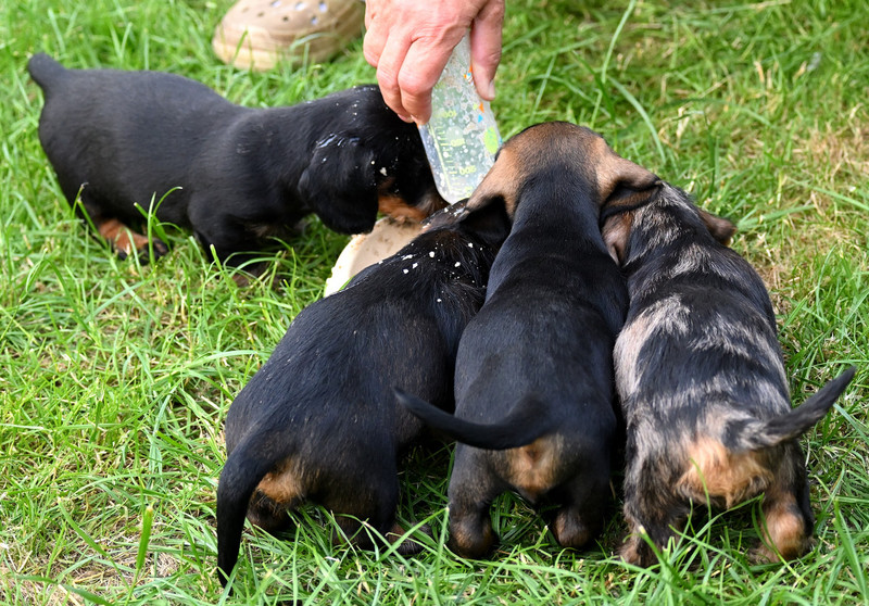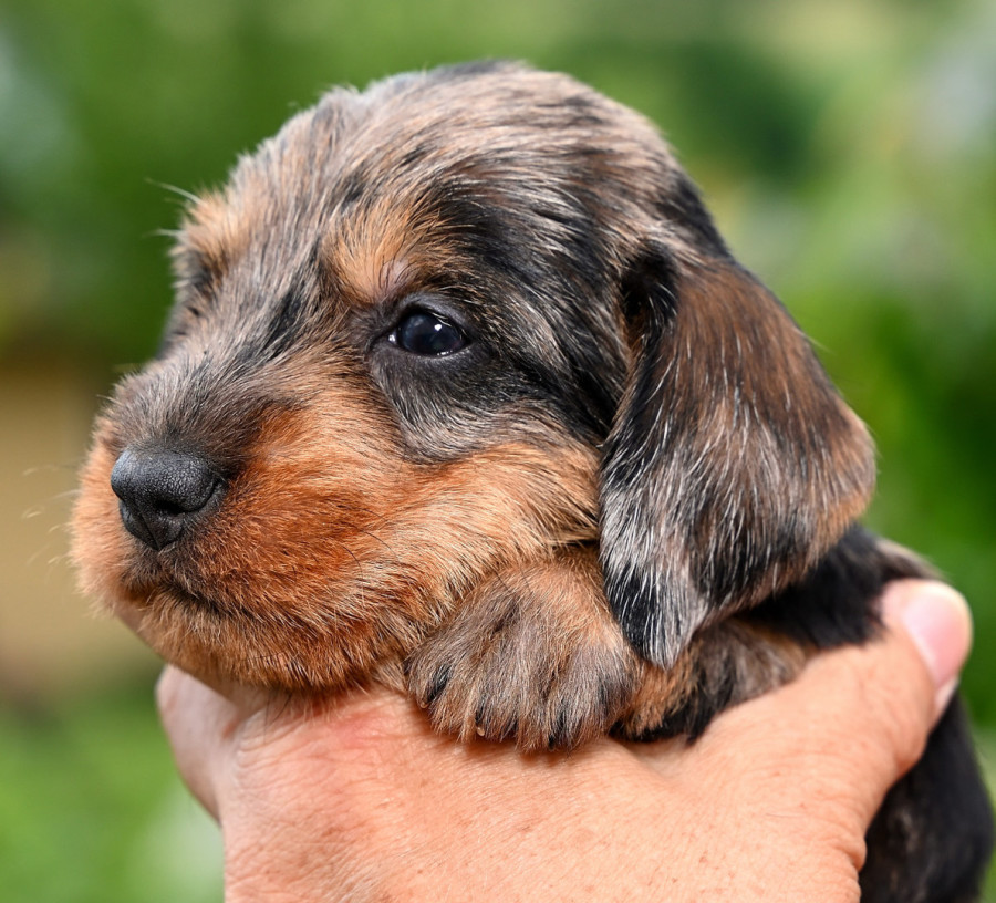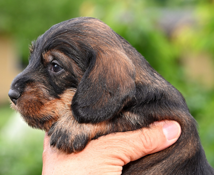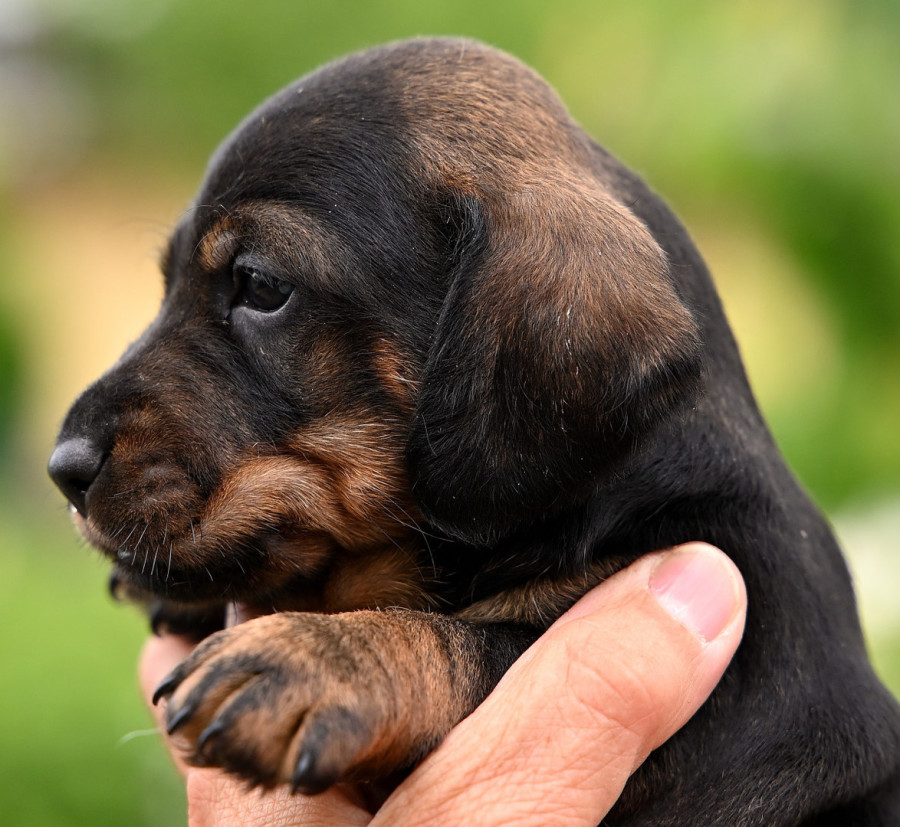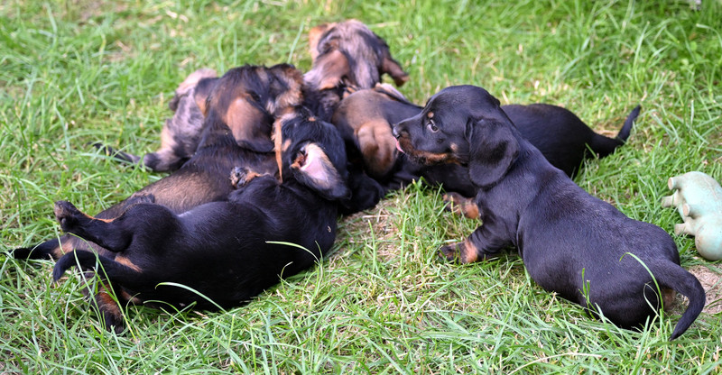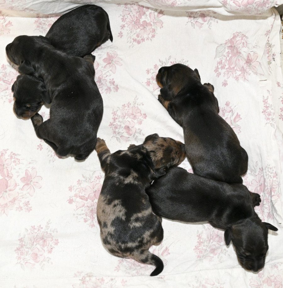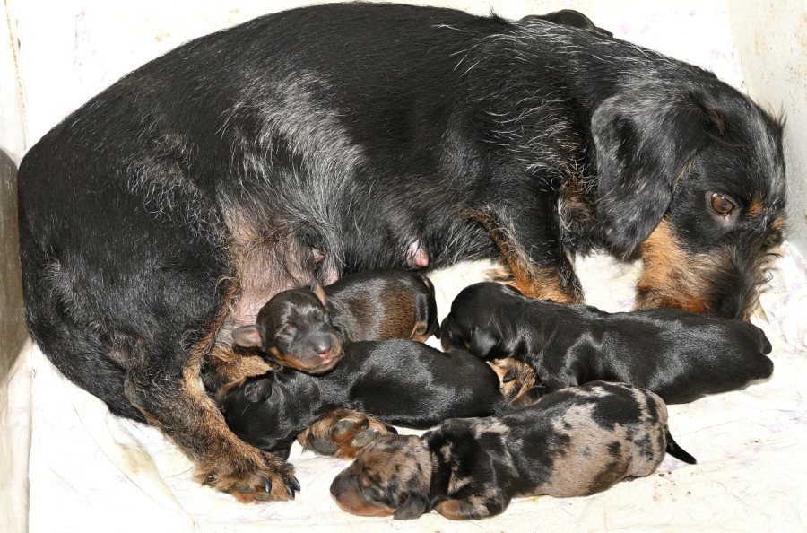 Ergebnis ist ein kräftiger 5er Wurf mit sehr guten Geburtsgewichten undmit hohem Biotonus. Es sind zwei dunkelsaufarbene Rüden, zwei schwarzrote Rüden und eine Saufarbentigerin.