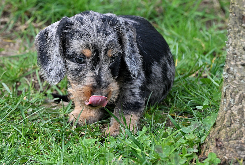 Stolzer Vater der Welpen ist der braunrote Rüde Graf Henry vom Waldesgraben, BHP-G, BhFK/95, BhN(F)/DIR, Sfk, Sp, St, StiJ, VpoSp, Wa.T., Formwert: sg