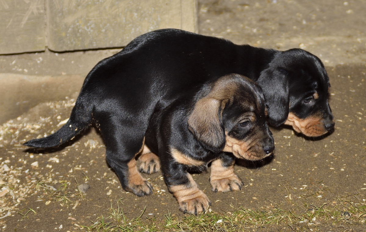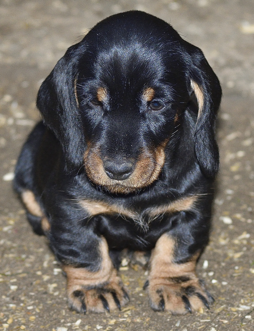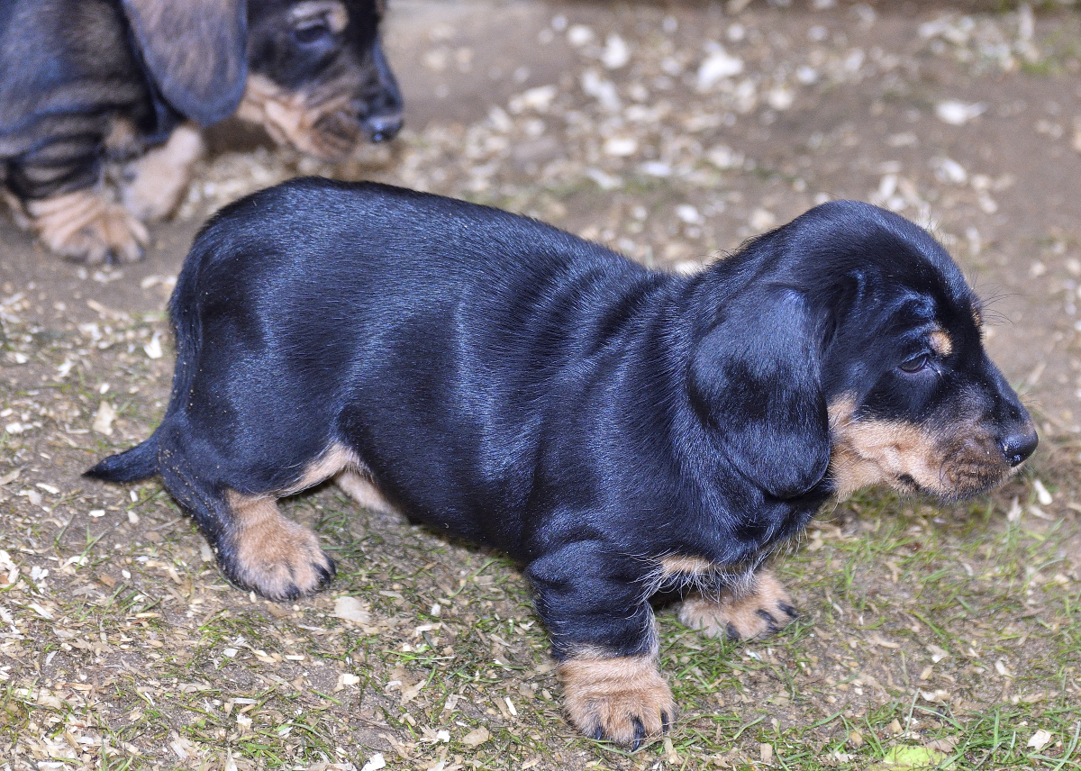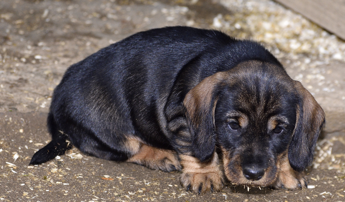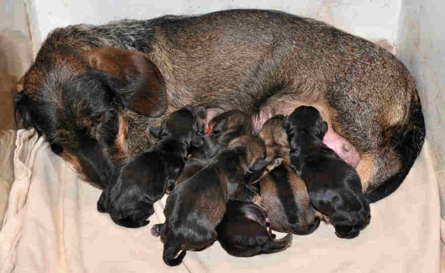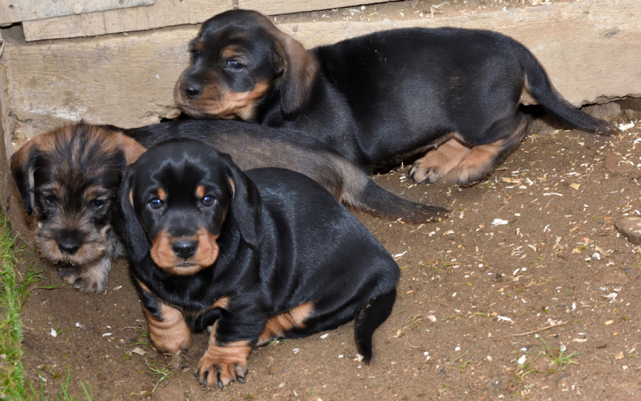 Es sind zwei Rüden in Schwarzrot und vier Hündinnen: zweimal dunkelsaufarben, einmal saufarben und einmal schwarzrot.