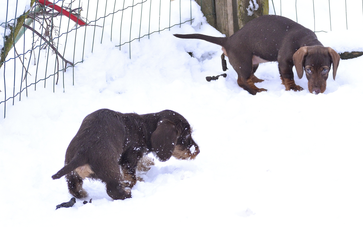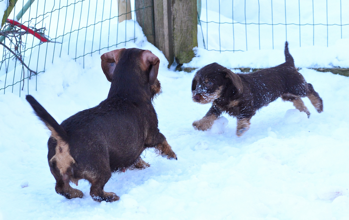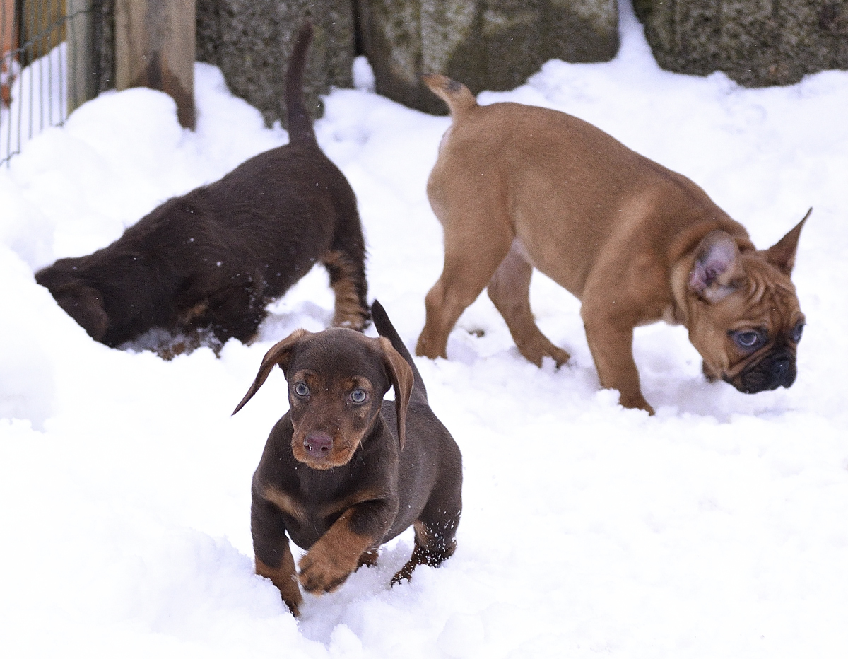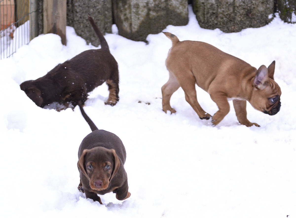 Der Januar ist halb herum und bis auf Pia, deren neues Herrchen noch in Kur ist, sind alle Welpen zu ihren neuen Familien gezogen. Wir haben massenhaft Schnee und das ist für die Welpen ein absolutes Eldorado: Petra und Pia und der Bully-Holdback von Elke, Chumani, hatten heute Nachmittag massenhaft Spaß in der weißen Pracht: