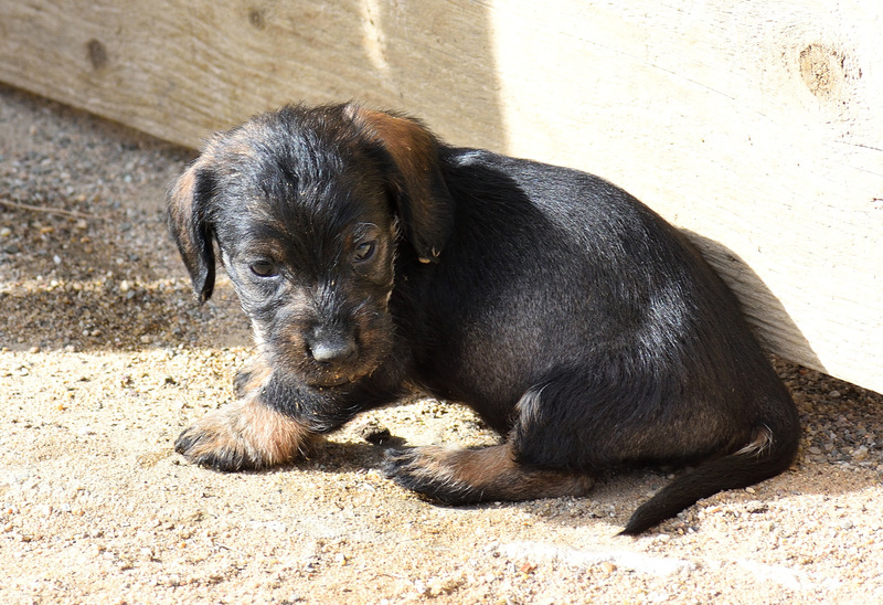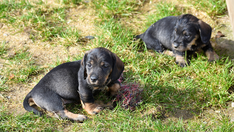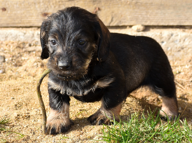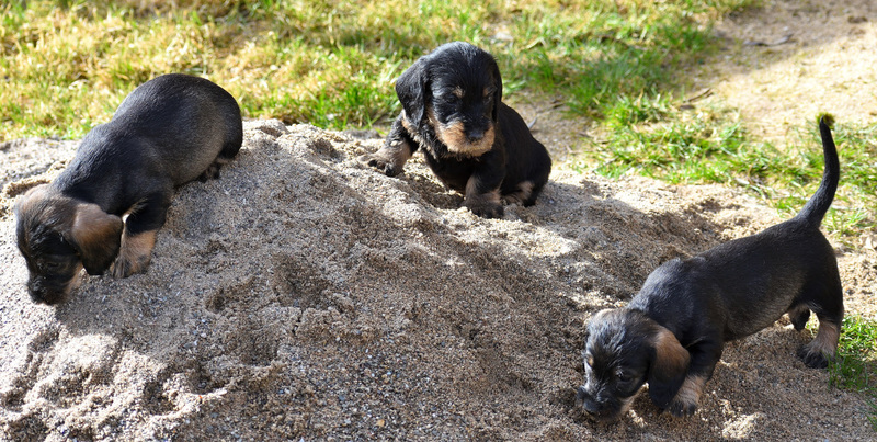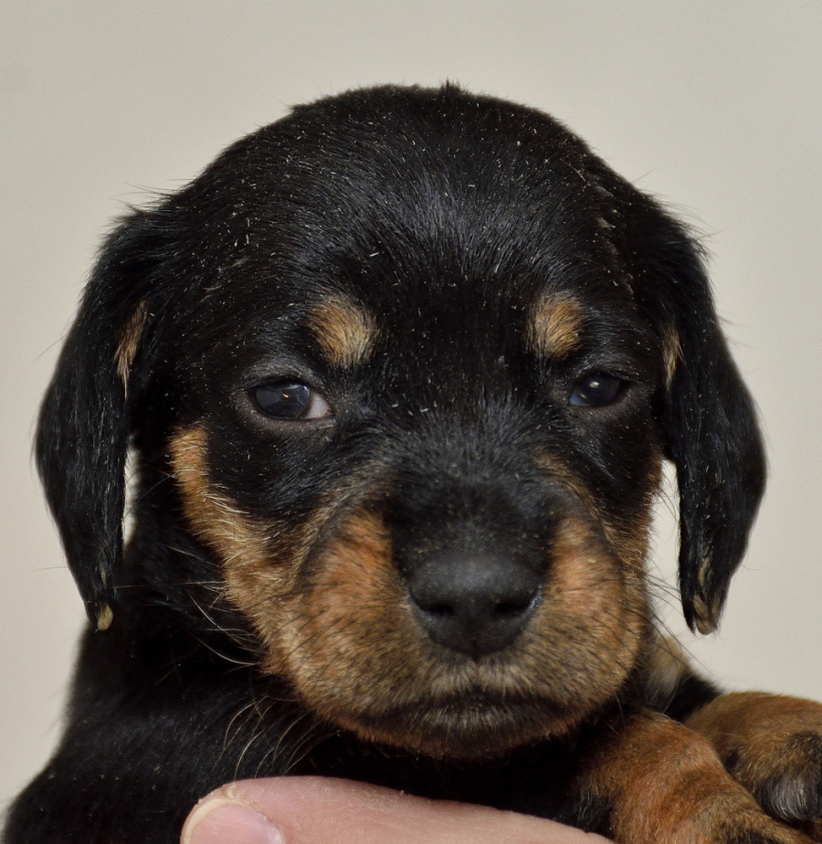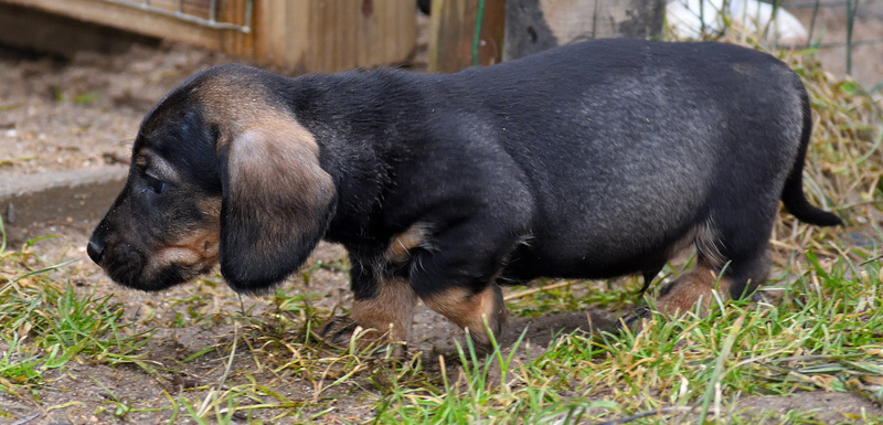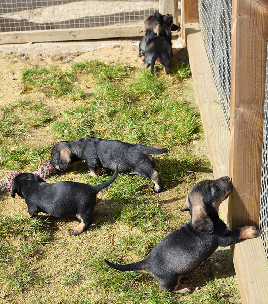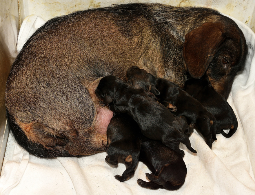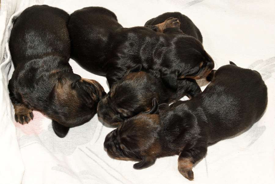 Juno mit ihren frischgewölften Welpen: Es sind vier Rüden, dreimal dunkelsaufarben und einmal schwarzrot sowie zwei Hündinnen, schwarzrot und dunkelsaufarben.