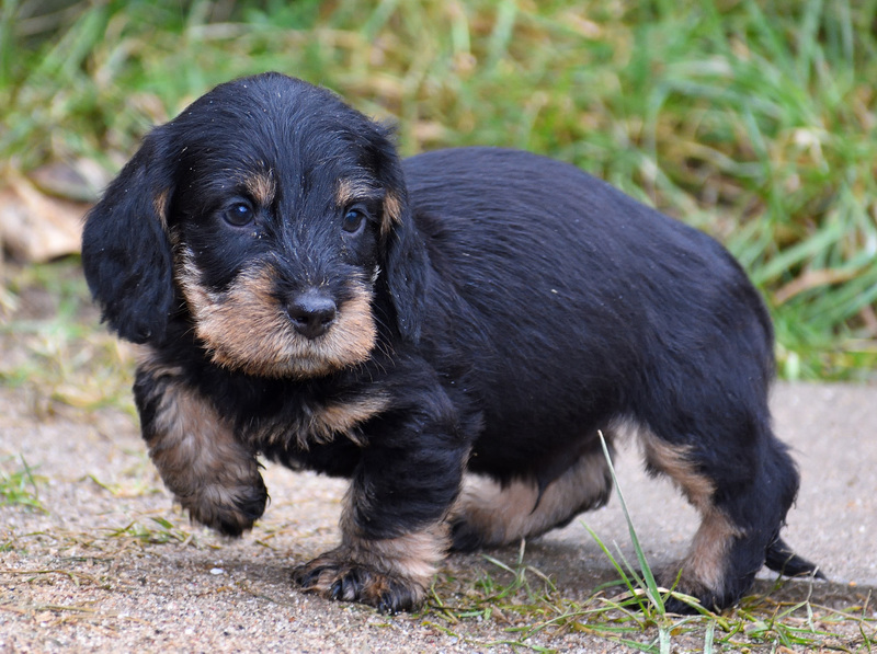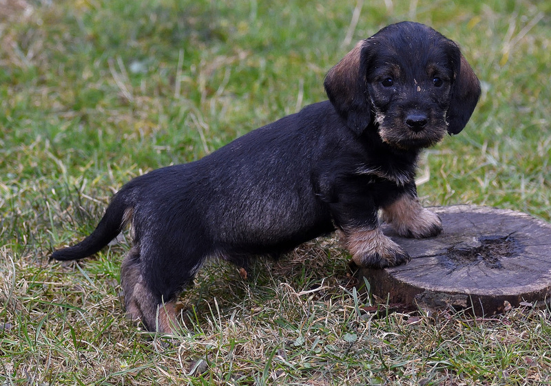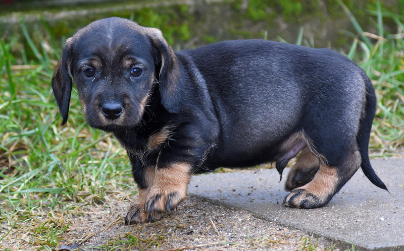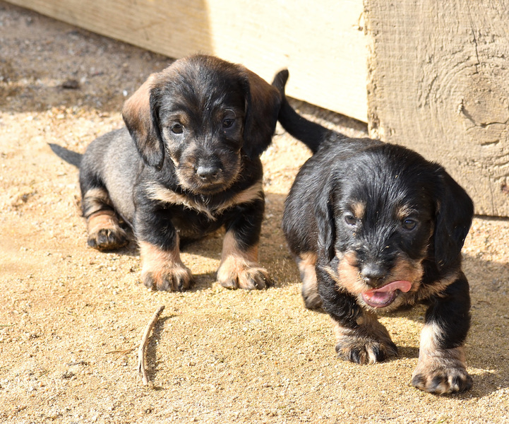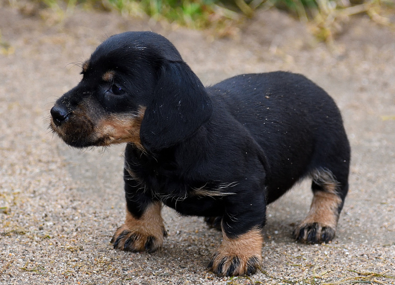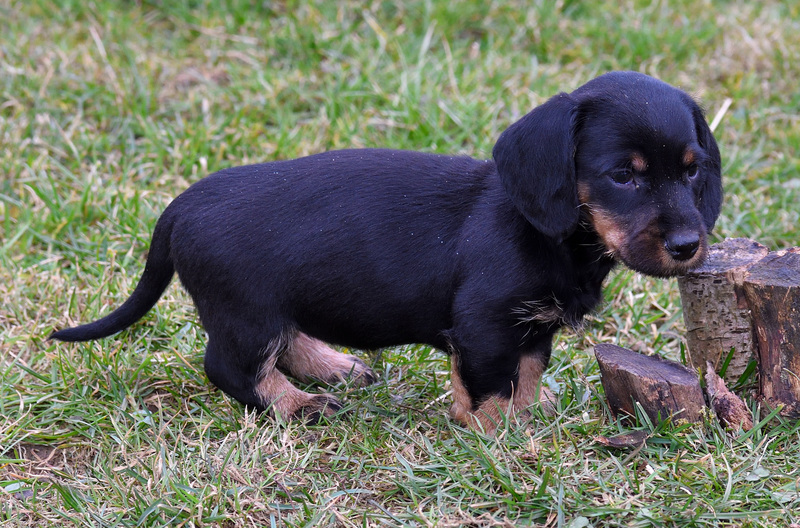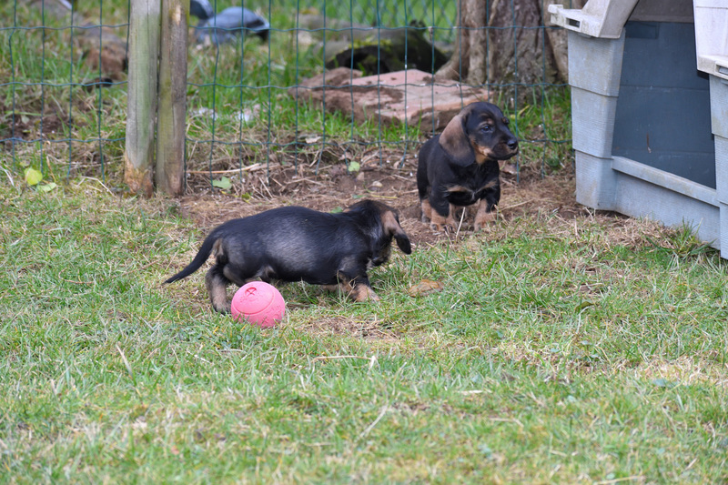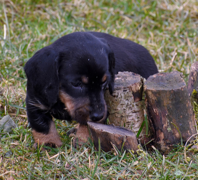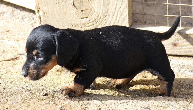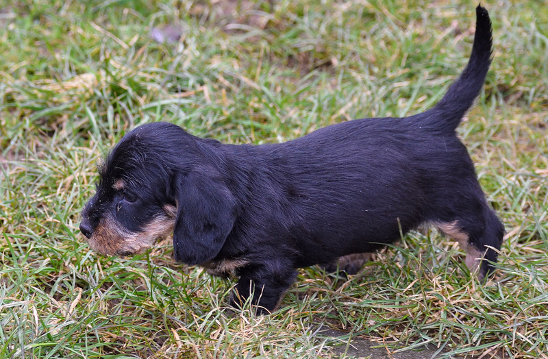 Juno mit ihren frischgewölften Welpen: Es sind vier Rüden, dreimal dunkelsaufarben und einmal schwarzrot sowie zwei Hündinnen, schwarzrot und dunkelsaufarben.