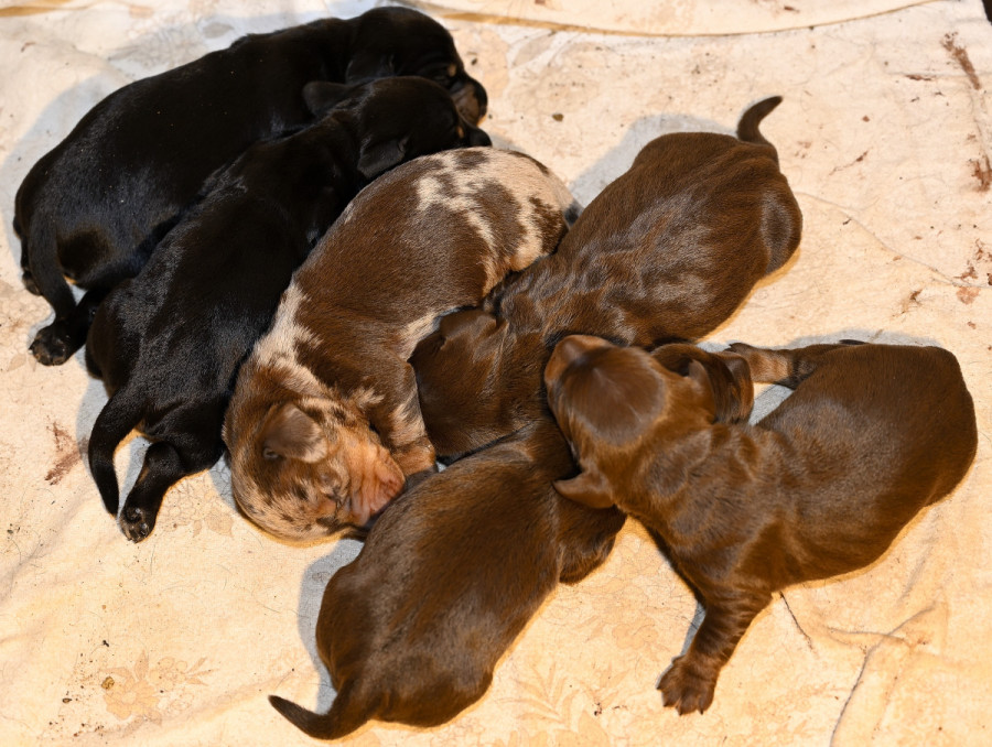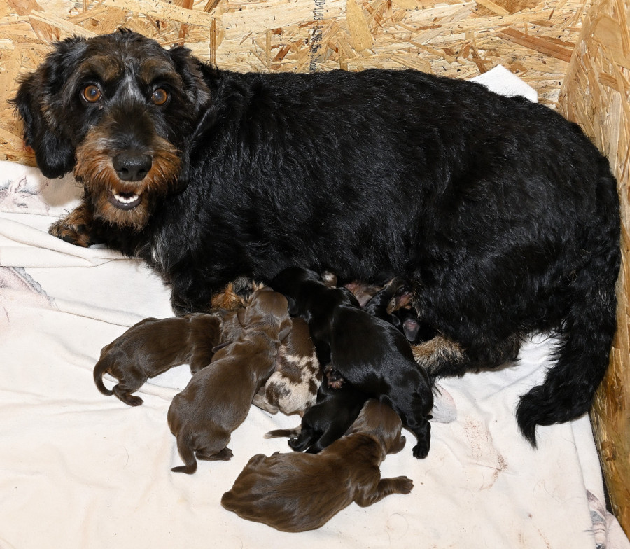 Am 9. Januar wölfte Molly ihren Sechserwurf, einen Brauntigerrüden, zwei schwarzrote Hündinnen und drei braunrote Hündinnen. Das ganze Werfen dauerte bei der routinierten Hündin weniger als zwei Stunden. Die Welpen sind fit und zeigen einen hohen Biotonus.